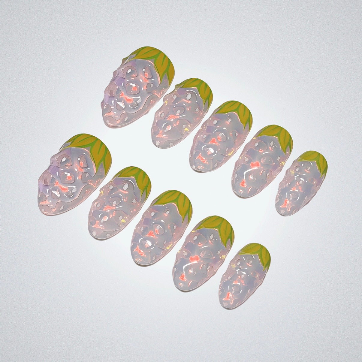Hand-crafted detailing and reflective chrome elements give each nail a fluid, almost crystal-like appearance. Bold yet refined, this set is perfect for those who love unique textures with a clean, high-fashion edge.
