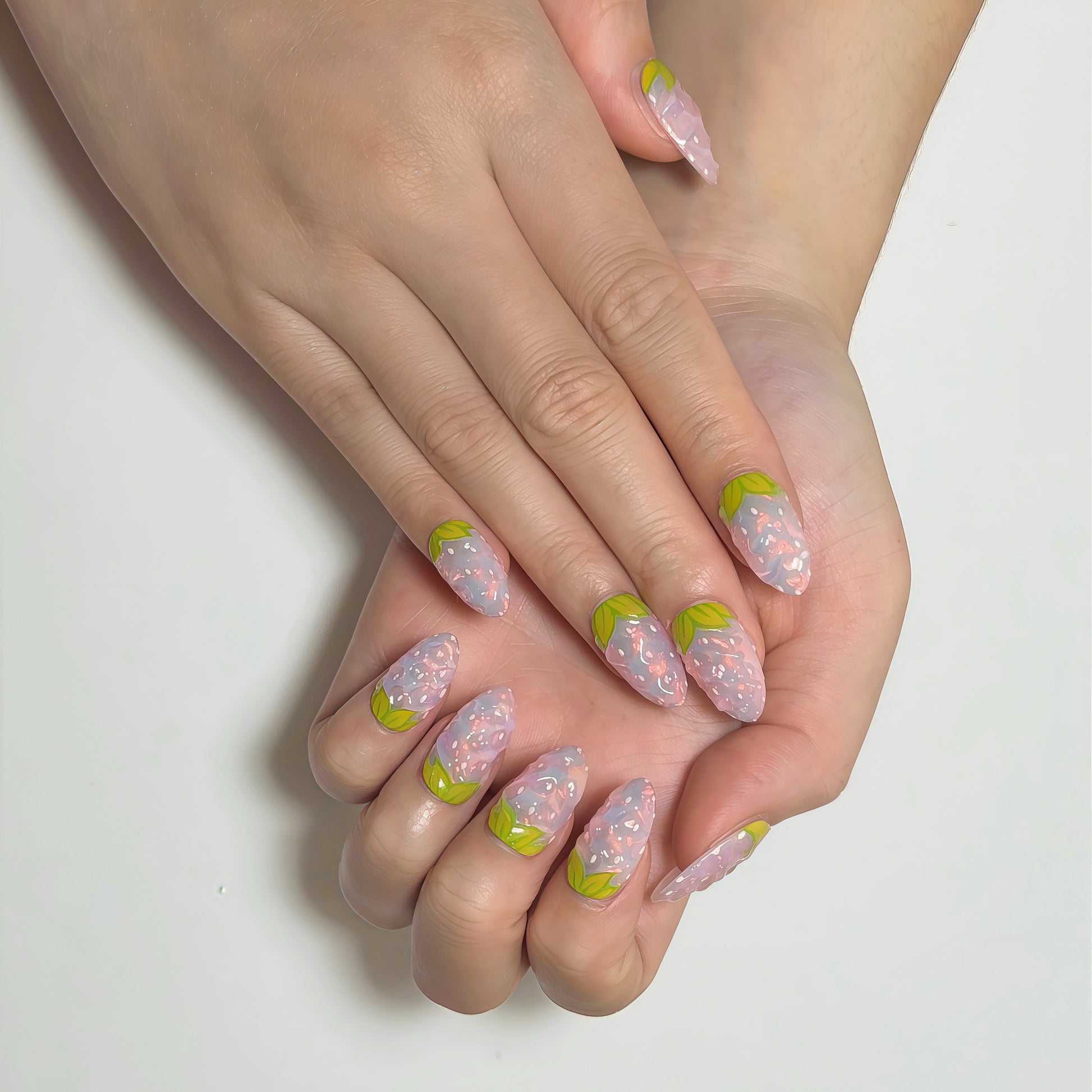 Crystal Berries features a translucent base layered with a soft chrome effect that reflects light with a pearly, glass-like finish. Sculpted textures create a juicy, dimensional surface, with subtle pink undertones.