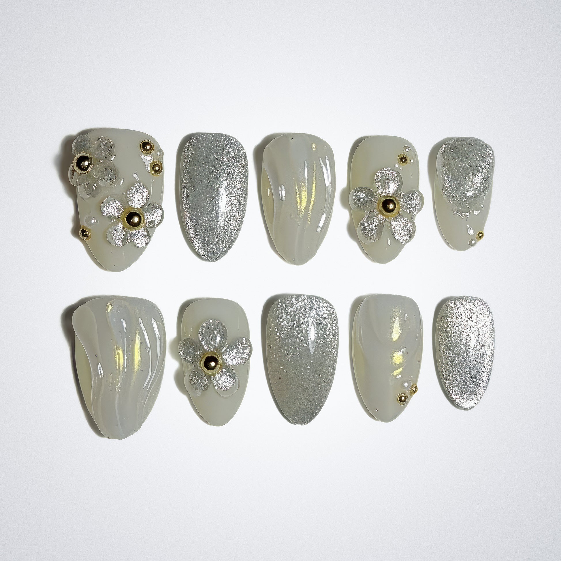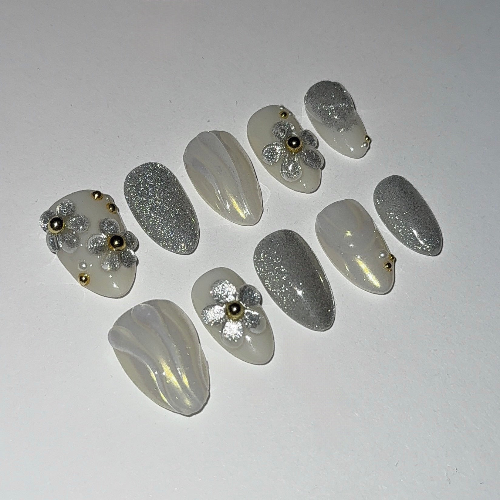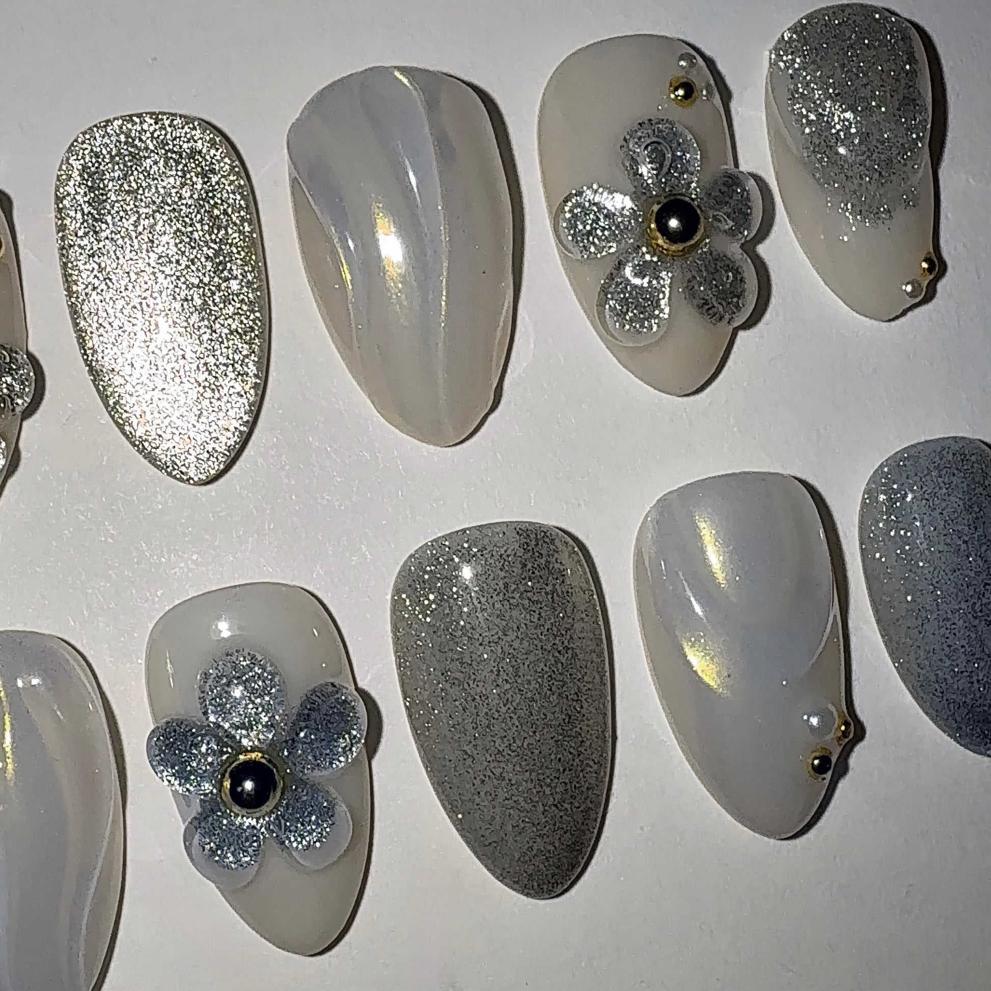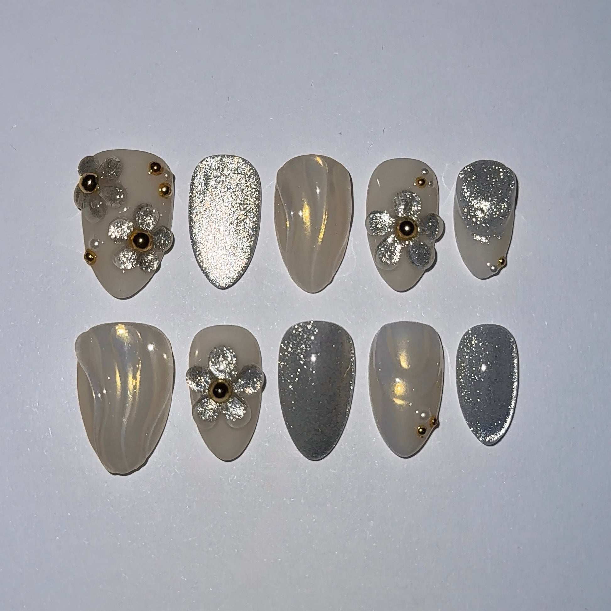 Golden Daisies features silver cat-eye effects with gold chrome. Perfect for those who prefer a shorter design and believe in "less is more".