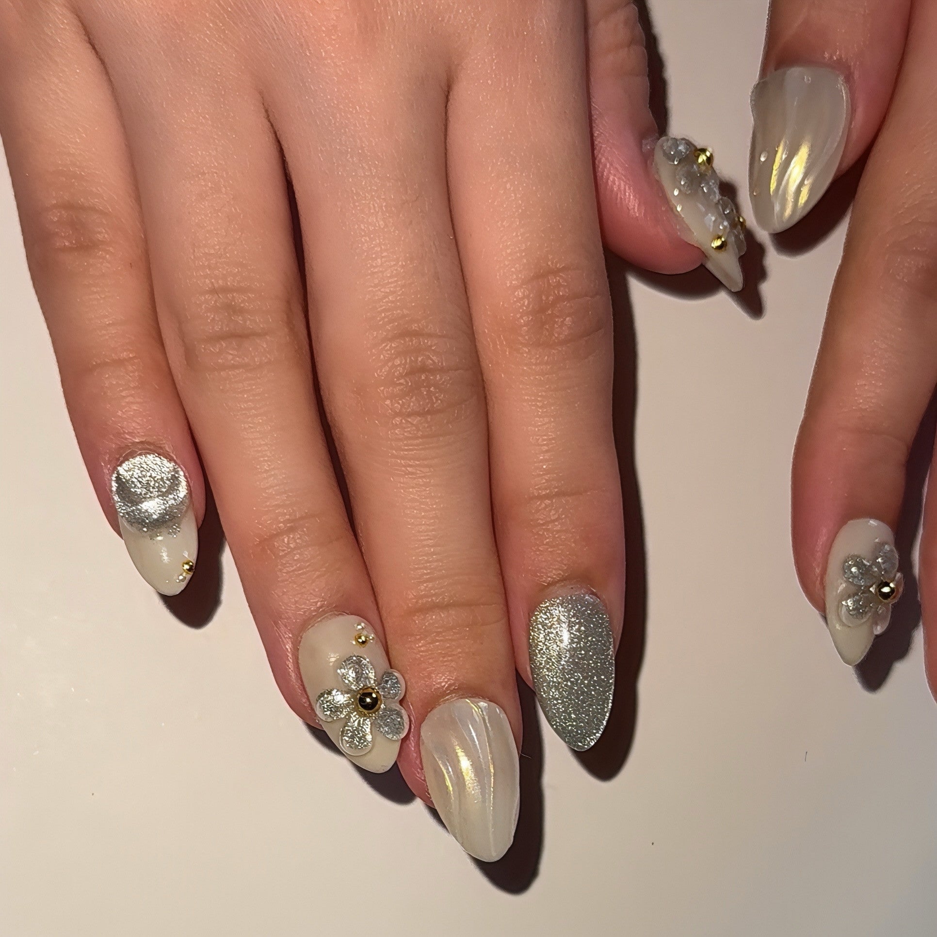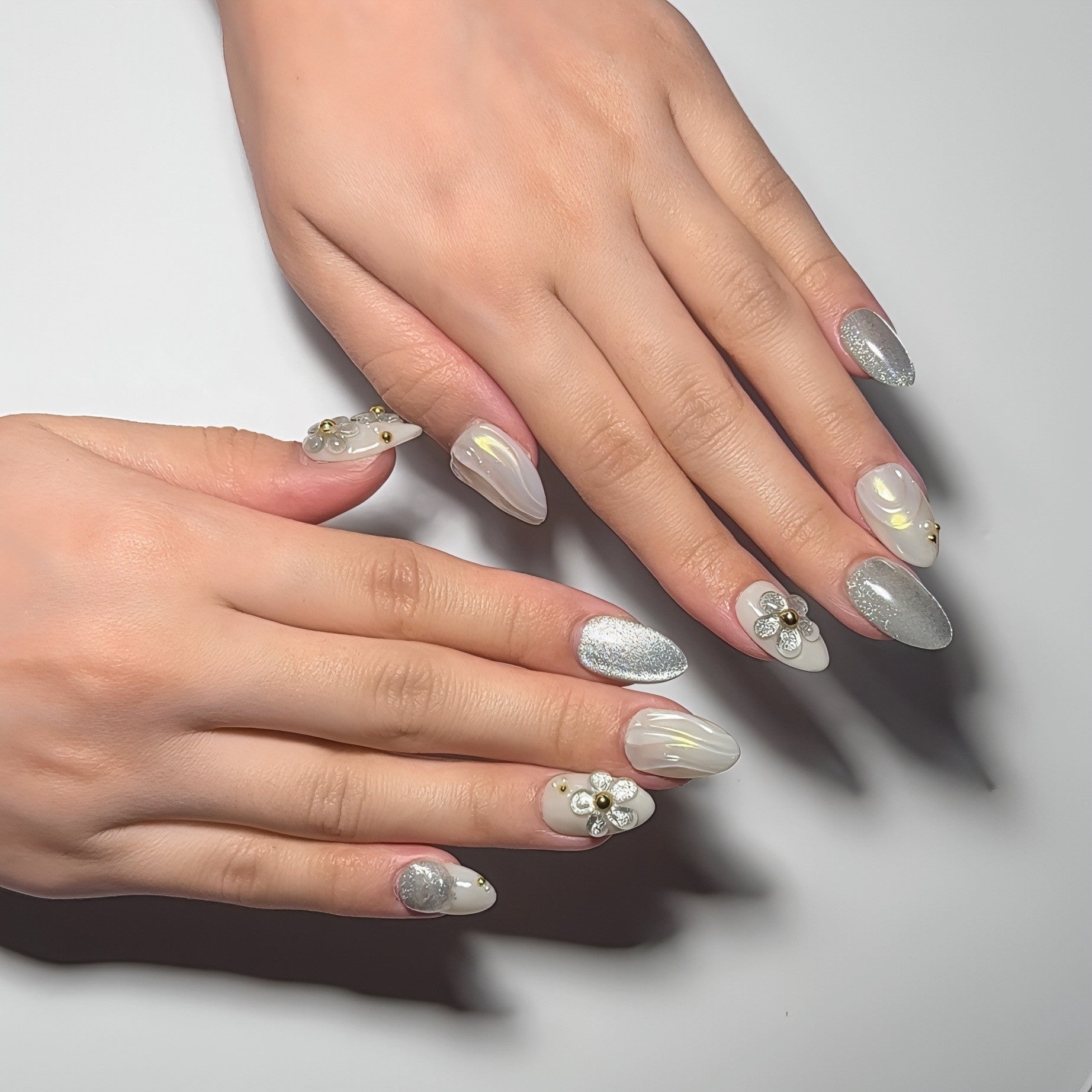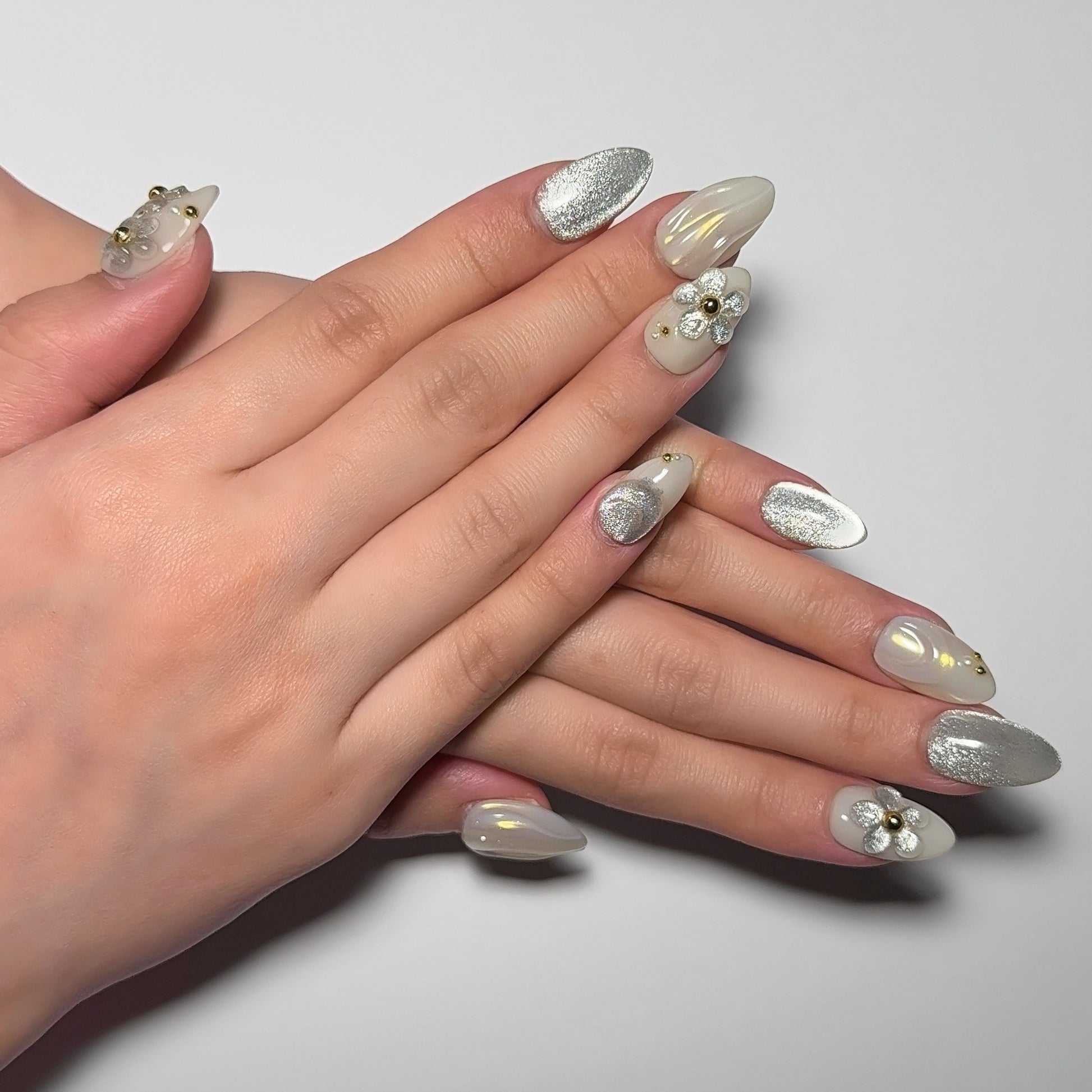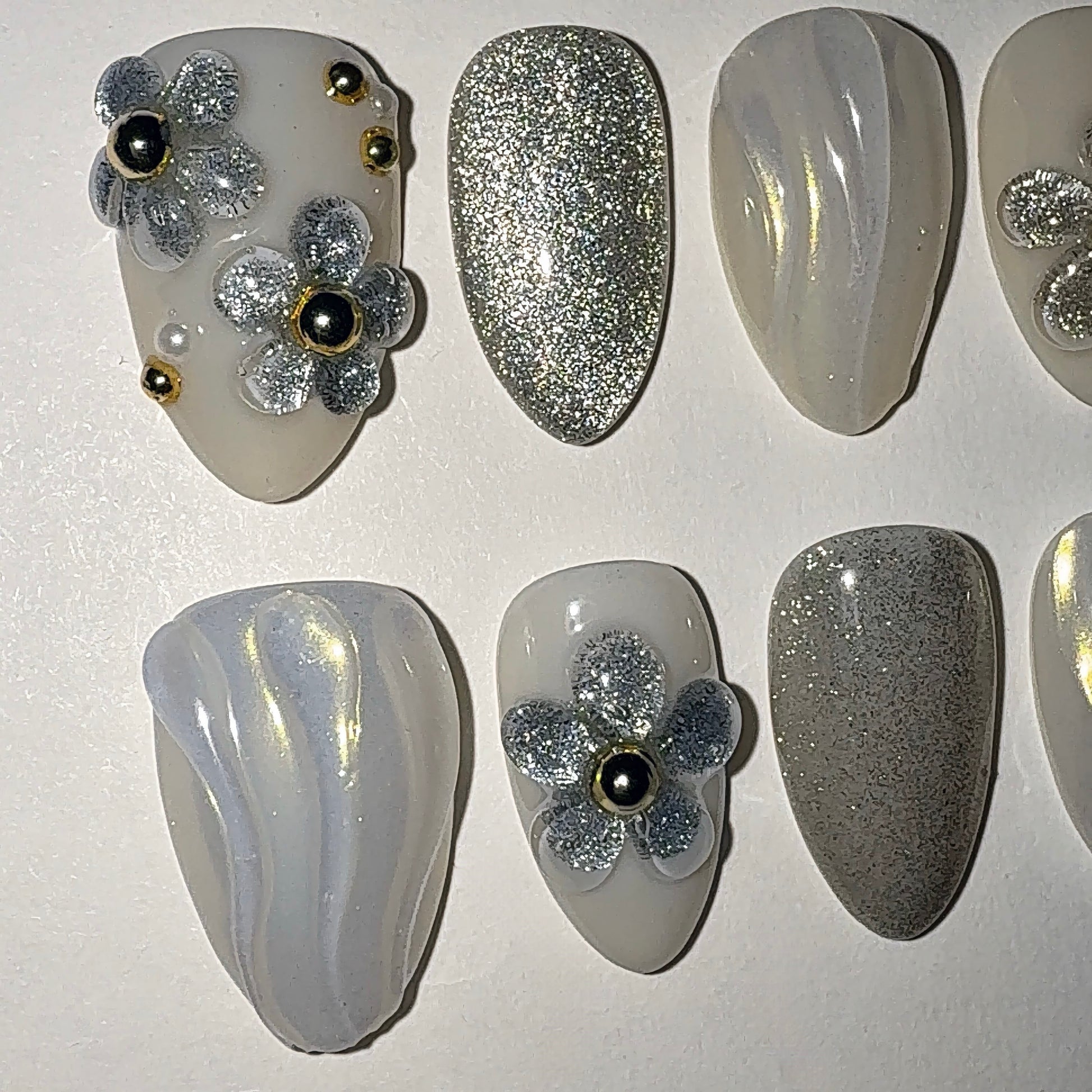 Golden Daisies features silver cat-eye effects with gold chrome. Perfect for those who prefer a shorter design and believe in "less is more".