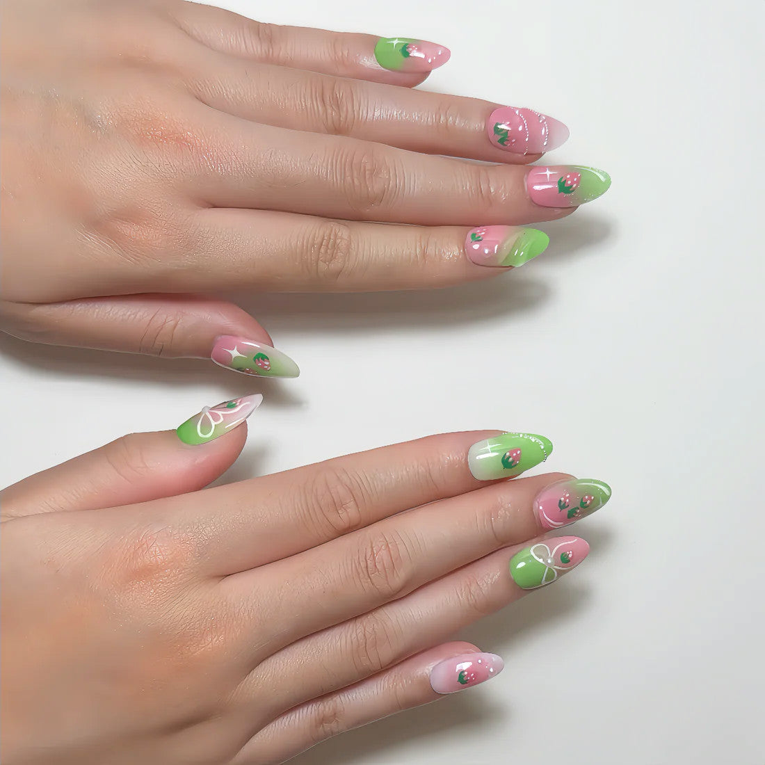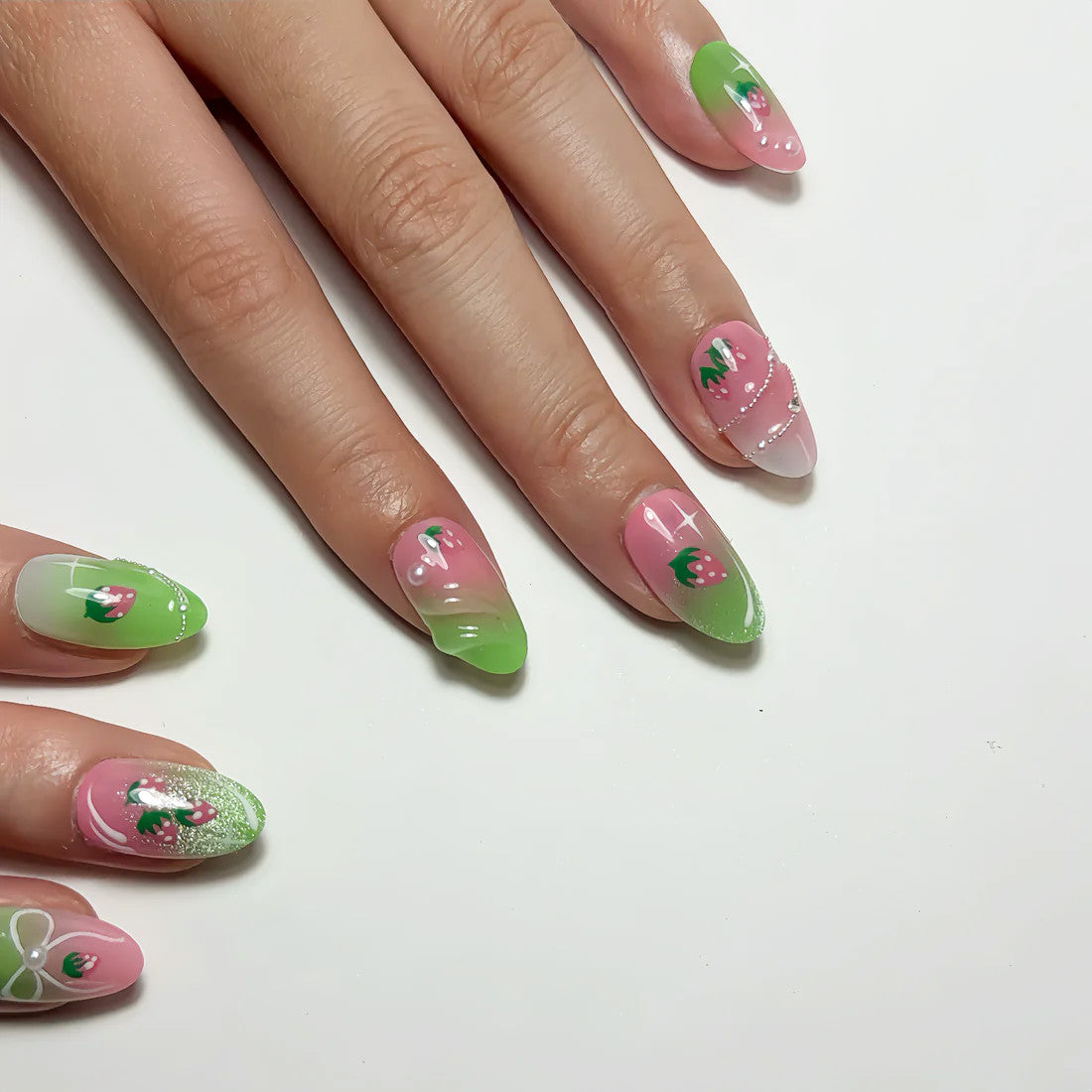 Strawberry Matcha is inspired by the refreshing drink, blending glossy pink-green gradients. Enhanced with a subtle cat-eye shimmer that catches the light beautifully.