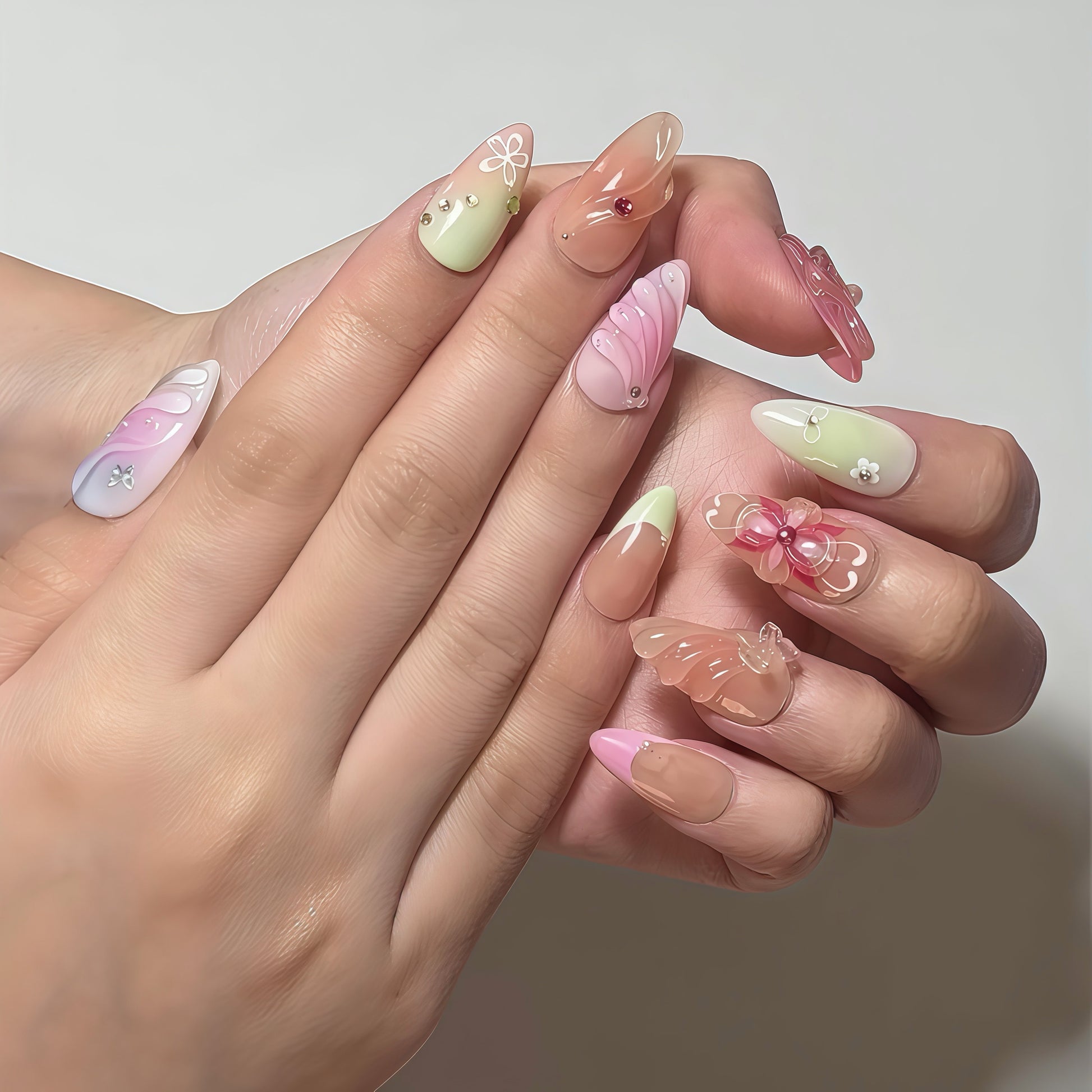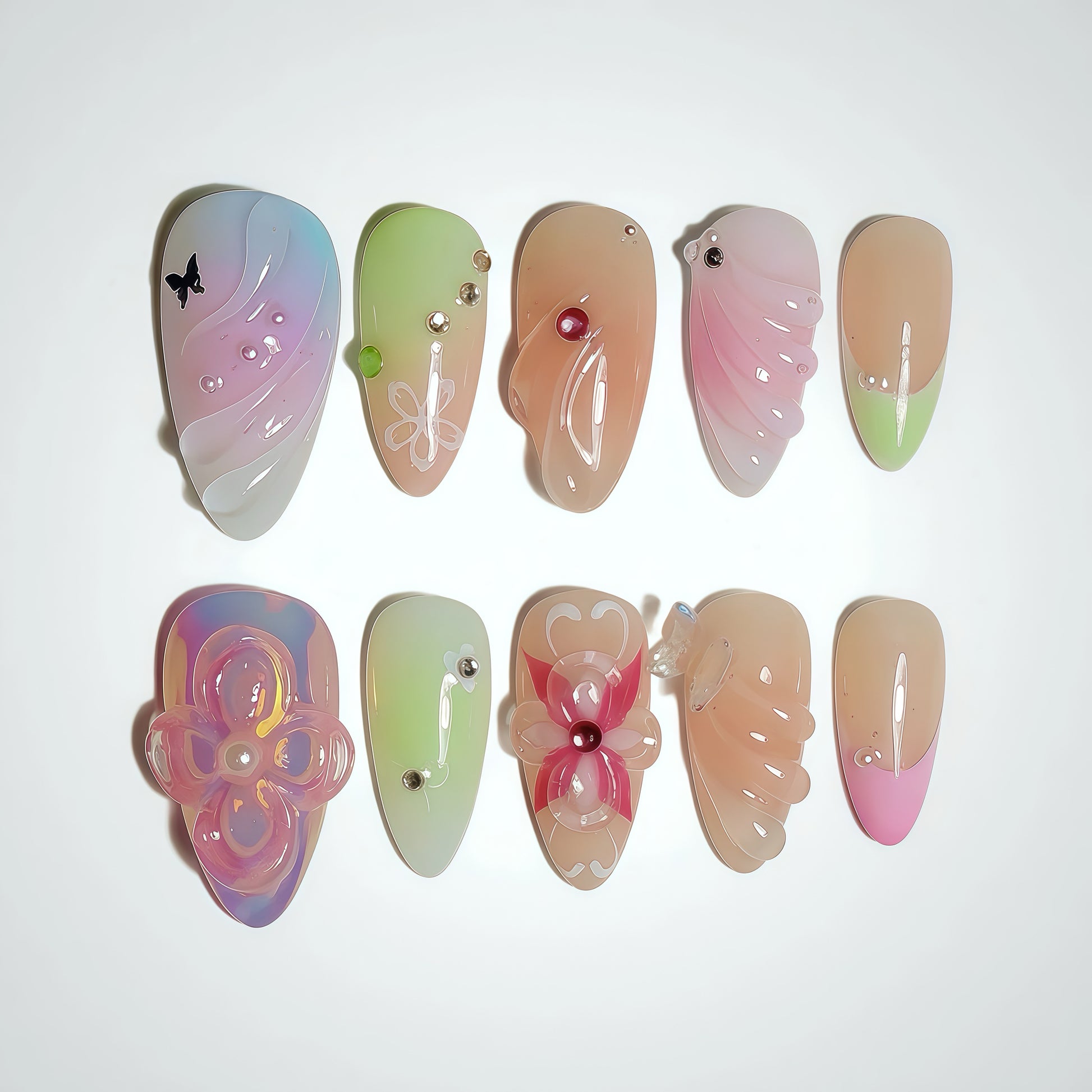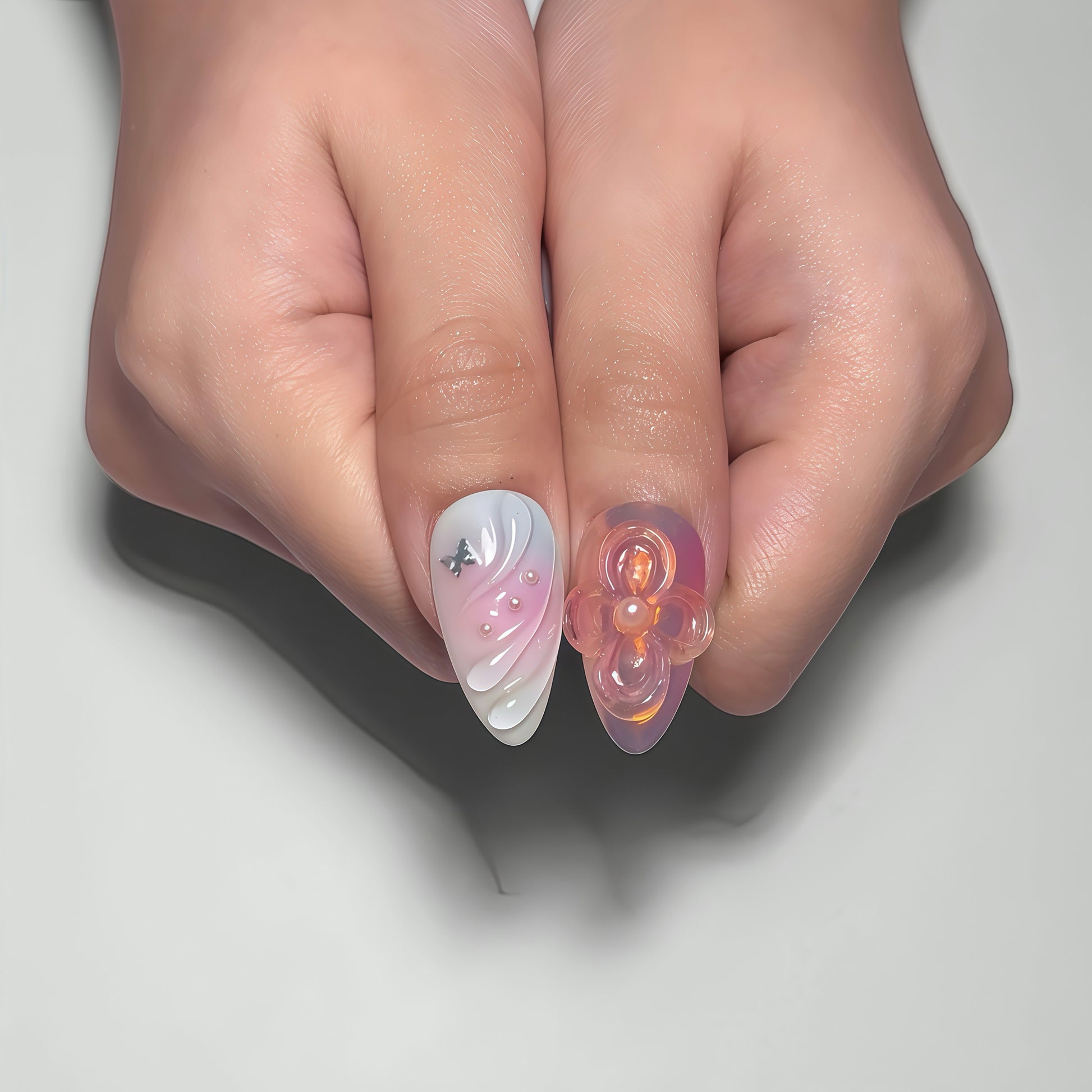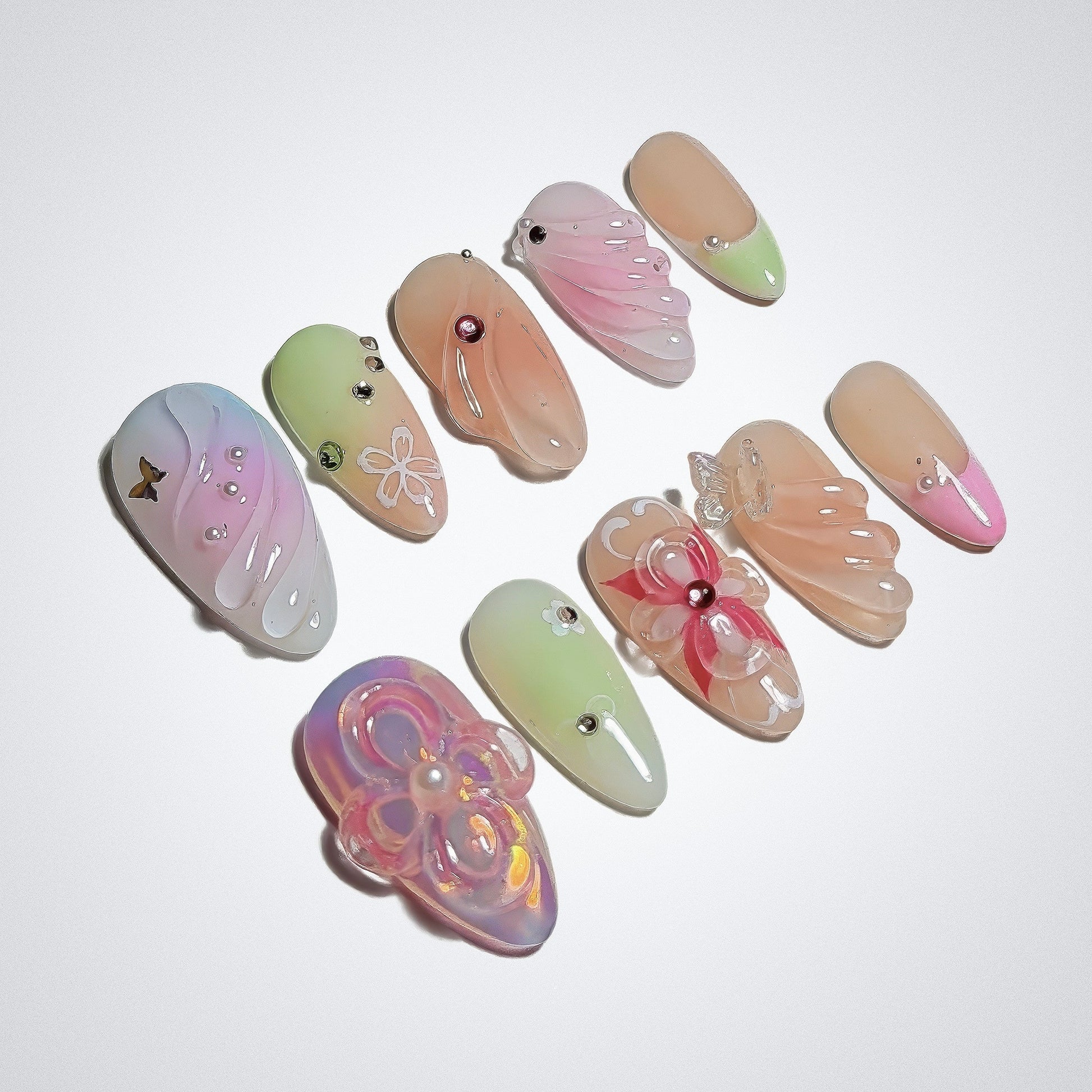 The beautiful flowers are hand crafted and hand-drawn to ensure the best quality details. A 3D iridescent butterfly is featured to add a dreamy touch to your nails.
