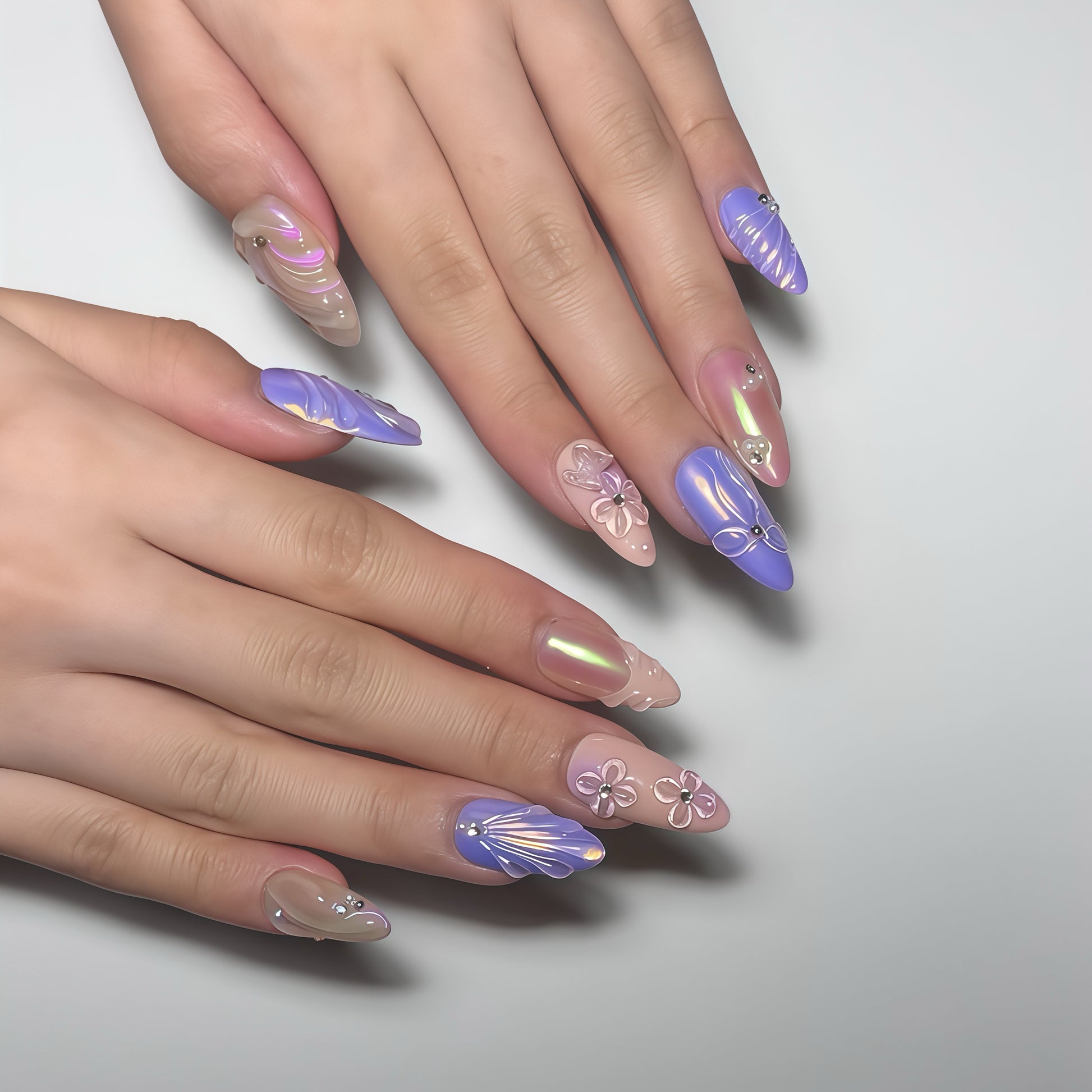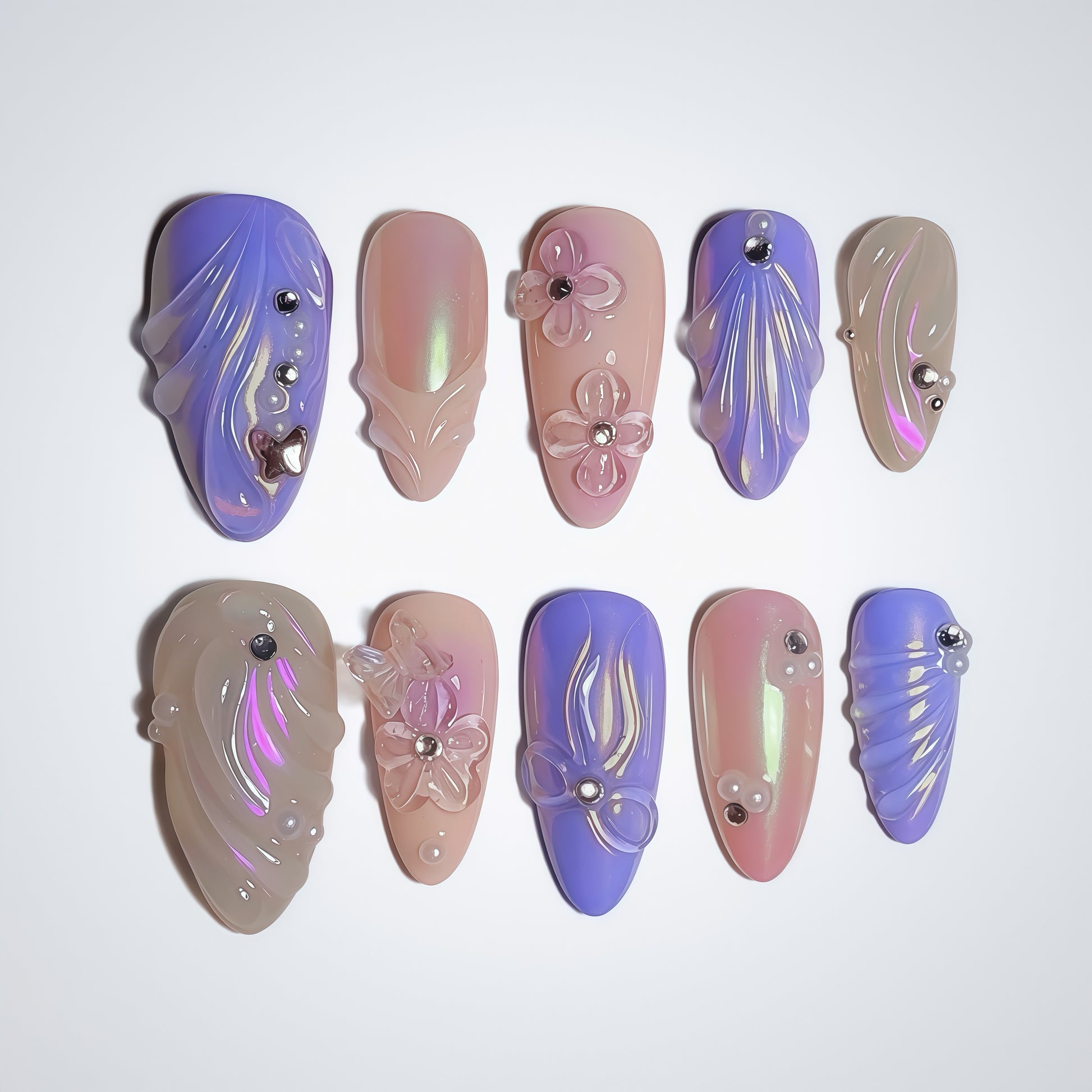 Each nail features delicate 3D sculpted petals, and whimsical floral shapes that feel both playful and polished.